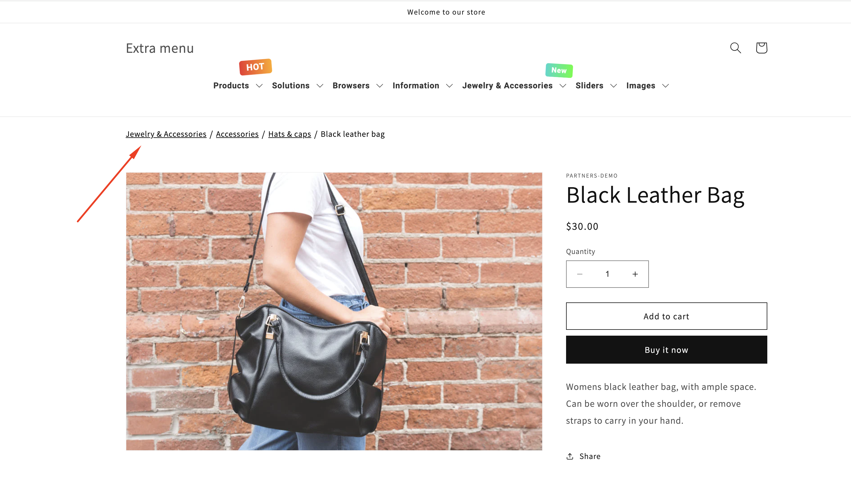 <figure><img src="https://3637410424-files.gitbook.io/~/files/v0/b/gitbook-x-prod.appspot.com/o/spaces%2F2cjmzPKyasfAe0Rwk5RU%2Fuploads%2FIEdFdZk2QlZf6JnNvjtd%2Fimage.png?alt=media&#x26;token=02b4835a-5a52-47a7-99ea-44836ccfba22" alt=""><figcaption><p>Breadcrumbs on live store</p></figcaption></figure>